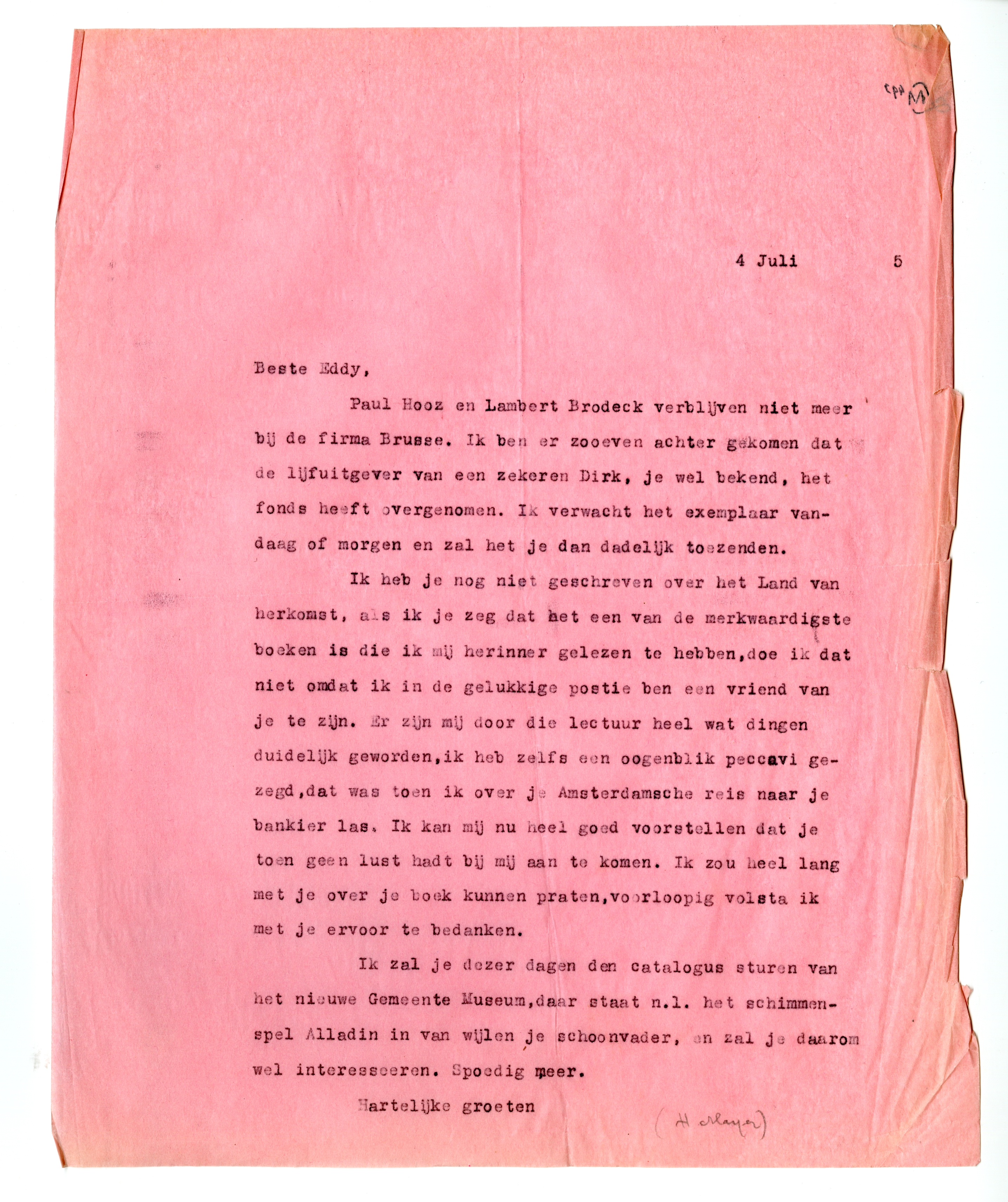 Paul Hooz en Lambert Brodeck verblijven niet meer bij de firma Brusse. Ik ben er zooeven achter gekomen dat de lijfuitgever van een zekeren Dirk, je wel bekend, het fonds heeft overgenomen. Ik verwacht het exemplaar vandaag of morgen en zal het je dan dadelijk toezenden.