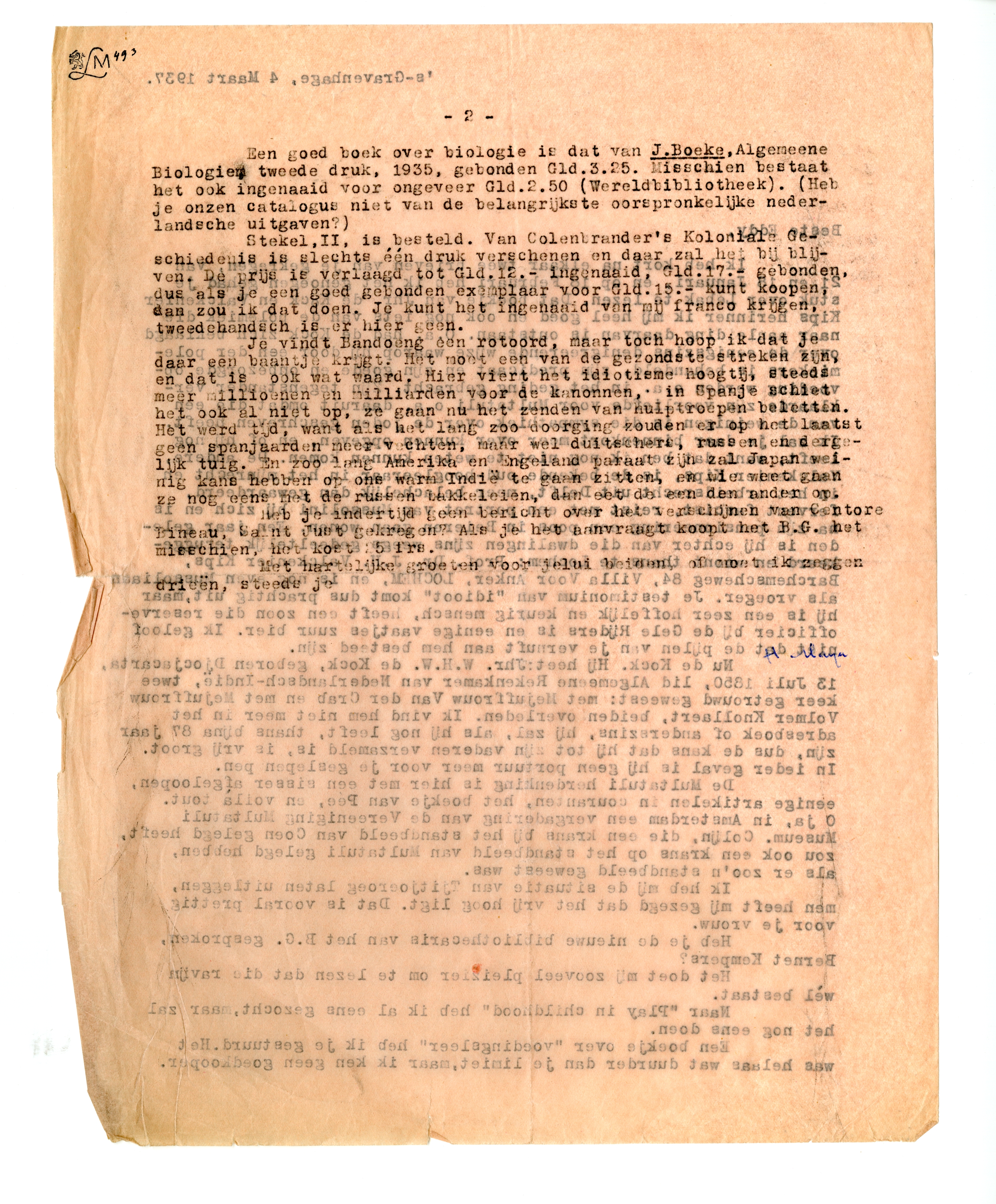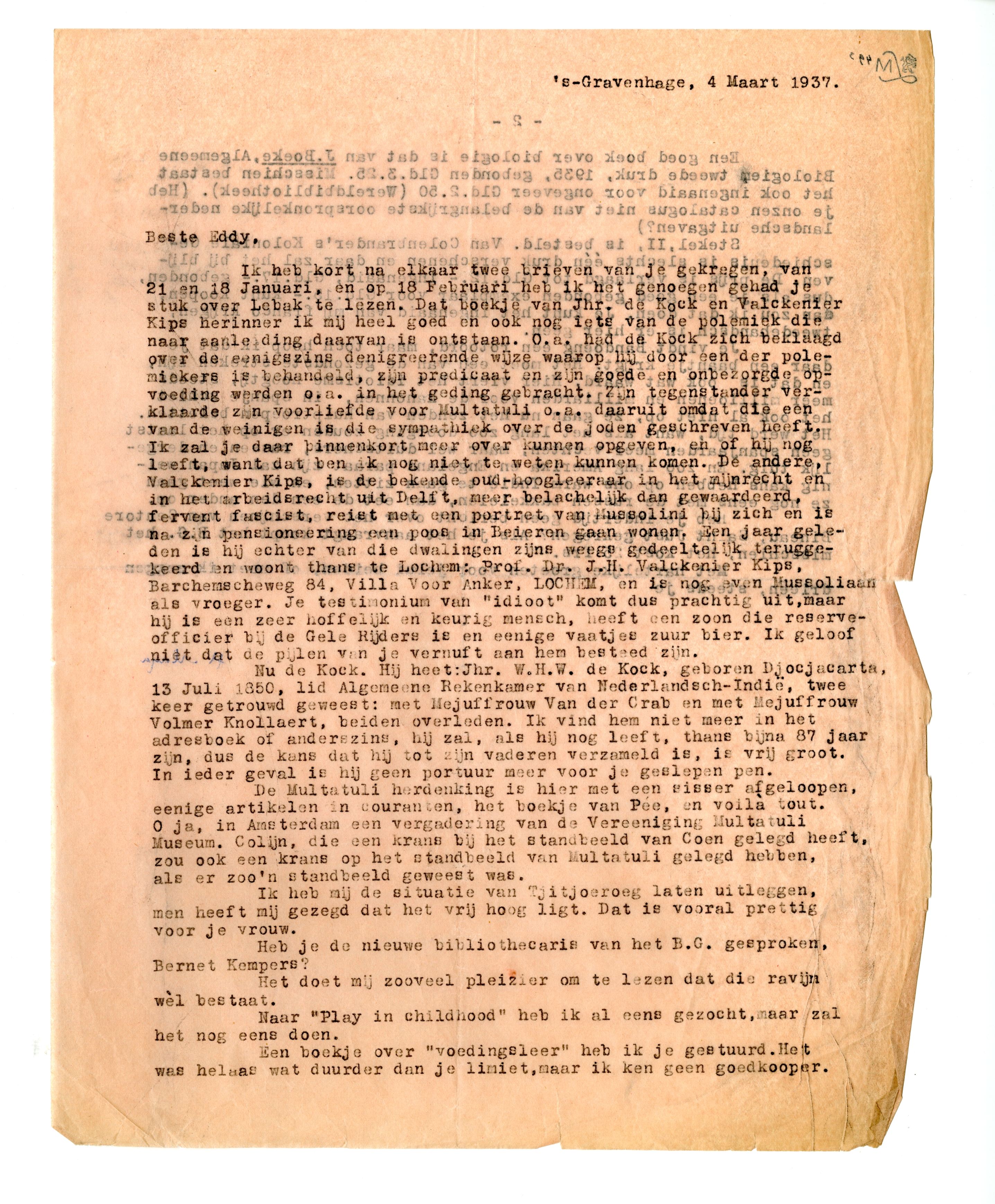 Ik heb kort na elkaar twee brieven van je gekregen, van 21 en 18 Januari, en op 18 Februari heb ik het genoegen gehad je stuk over Lebak te lezen. Dat boekje van Jhr. de Kock en Valckenier Kips herinner ik mij heel goed en ook nog iets van de polemiek die naar aanleiding daarvan is ontstaan. O.a. had de Kock zich beklaagd over de eenigszins denigreerende wijze waarop hij door een der polemiekers is behandeld, zijn predicaat en zijn goede en onbezorgde opvoeding werden o.a. in het geding gebracht. Zijn tegenstander verklaarde zijn voorliefde voor Multatuli o.a. daaruit omdat die een van de weinigen is die sympathiek over de joden geschreven heeft. Ik zal je daar binnenkort meer over kunnen opgeven, en of hij nog leeft, want dat ben ik nog niet te weten kunnen komen. De andere, Valckenier Kips, is de bekende oud-hoogleeraar in het mijnrecht en in het arbeidsrecht uit Delft, meer belachelijk dan gewaardeerd, fervent fascist, reist met een portret van Mussolini bij zich en is na zijn pensioneering een poos in Beieren gaan wonen. Een jaar geleden is hij echter van die dwalingen zijns weegs gedeeltelijk teruggekeerd en woont thans te Lochem: Prof. Dr. J.H. Valckenier Kips, Barchemscheweg 84, Villa Voor Anker, LOCHEM, en is nog even Mussoliaan als vroeger. Je testimonium van ‘idioot’ komt dus prachtig uit, maar hij is een zeer hoffelijk en keurig mensch, heeft een zoon die reserve-officier bij de Gele Rijders is en eenige vaatjes zuur bier. Ik geloof niet dat de pijlen van je vernuft aan hem besteed zijn.