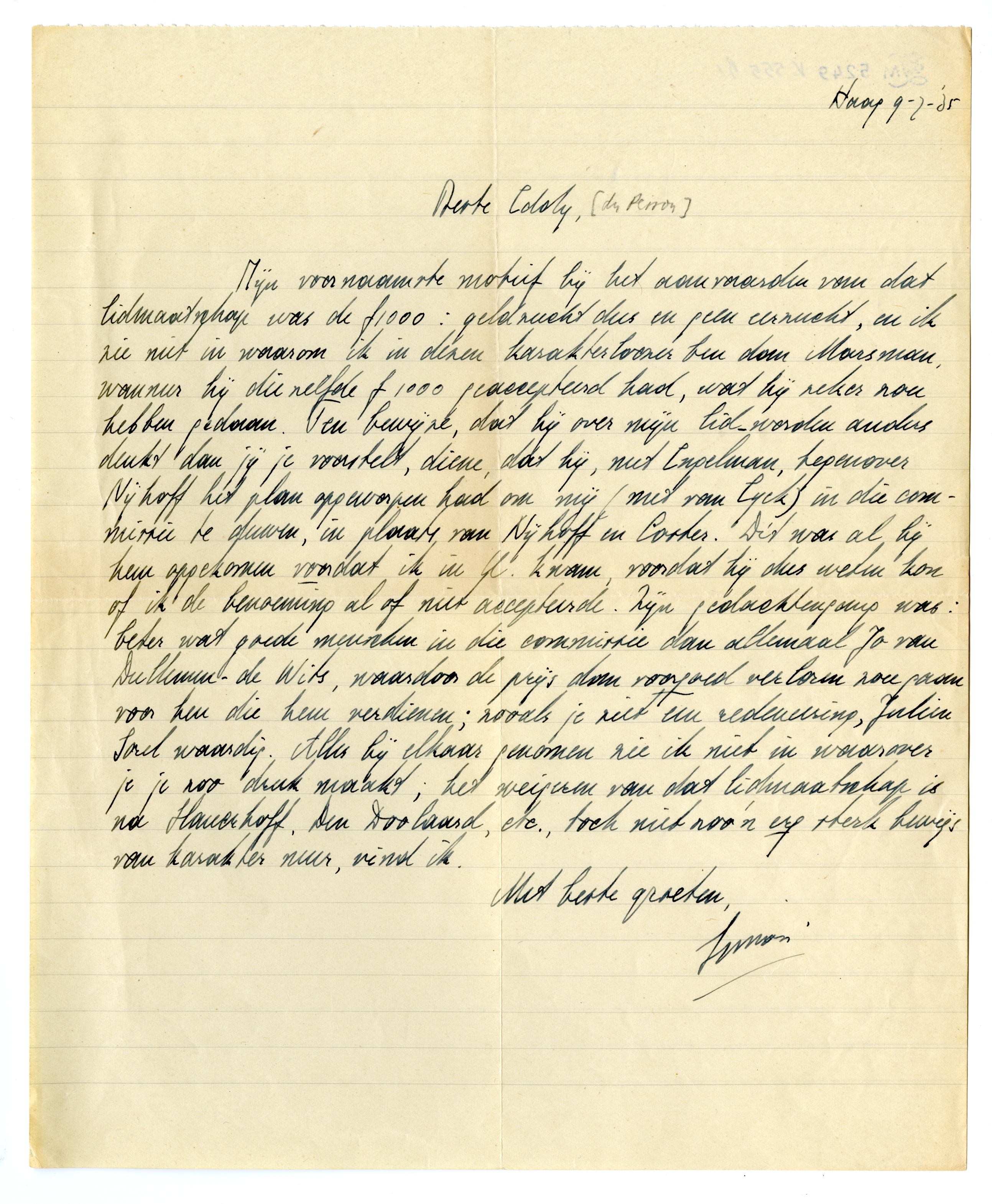 Mijn voornaamste motief bij het aanvaarden van dat lidmaatschap was de f 1000: geldzucht dus en geen eerzucht, en ik zie niet in waarom ik in dezen karakterloozer ben dan Marsman, wanneer hij die zelfde f 1000 geaccepteerd had, wat hij zeker zou hebben gedaan. Ten bewijze, dat hij over mijn lid-worden anders denkt dan jij je voorstelt, diene, dat hij, met Engelman, tegenover Nijhoff het plan opgeworpen had om mij (met van Eyck) in die commissie te duwen, in plaats van Nijhoff en Coster. Dit was al bij hem opgekomen voordat ik in U. kwam, voordat hij dus weten kon of ik de benoeming al of niet accepteerde. Zijn gedachtengang was: beter wat goede menschen in die commissie dan allemaal Jo van Dullemen-de Wits, waardoor de prijs dan voorgoed verloren zou gaan voor hen die hem verdienen; zooals je ziet een redeneering, Julien Sorel waardig. Alles bij elkaar genomen zie ik niet in waarover je je zoo druk maakt; het weigeren van dat lidmaatschap is na Slauerhoff, Den Doolaard, etc., toch niet zoo’n erg sterk bewijs van karakter meer, vind ik.