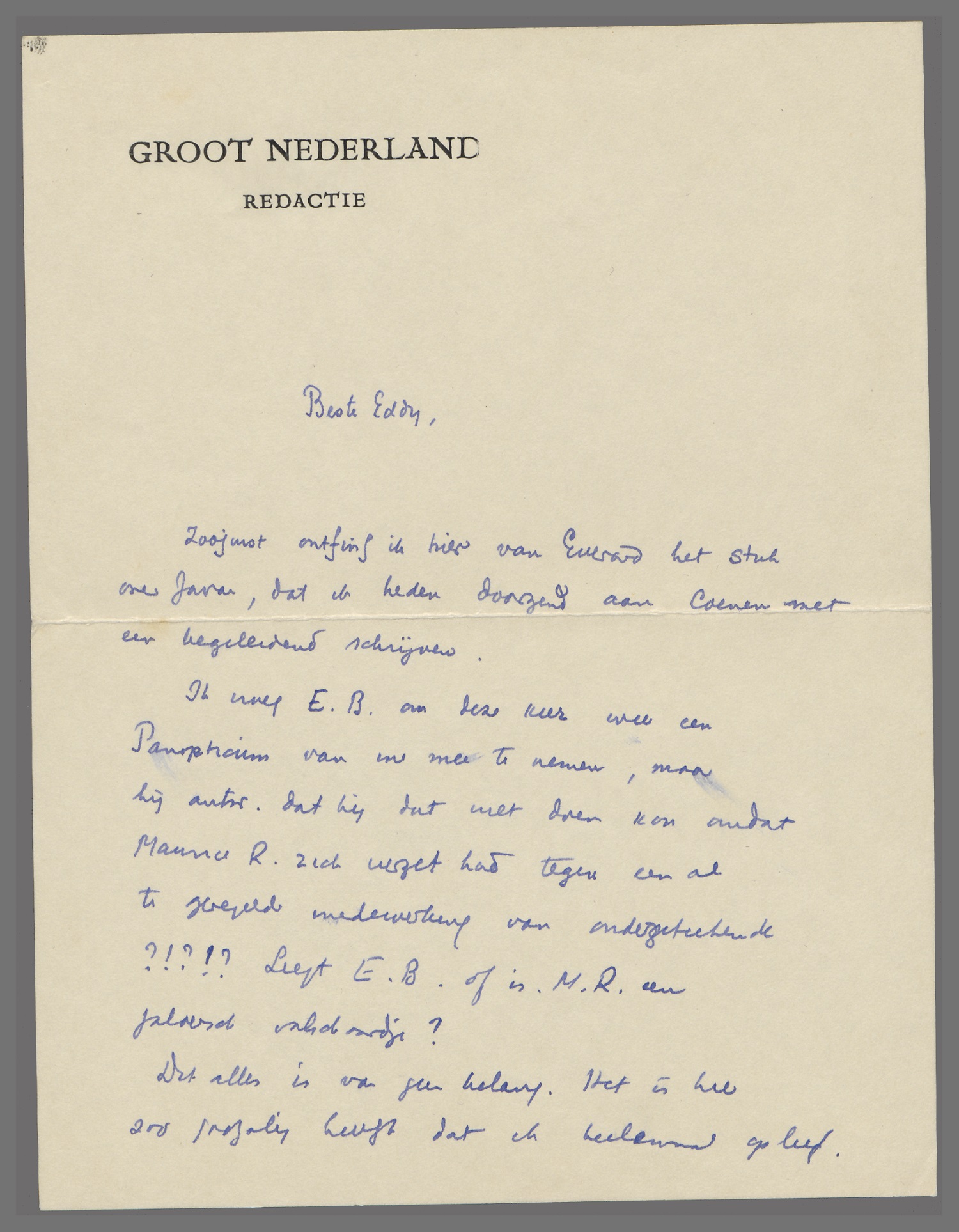 Ik vroeg E.B. om deze keer weer een Panopticum van me mee te nemen, maar hij antw. dat hij dat niet doen kon omdat Maurice R. zich verzet had tegen een al te geregelde medewerking van ondergeteekende ?!?!? Liegt E.B. of is M.R. een jaloersch valschaardje?