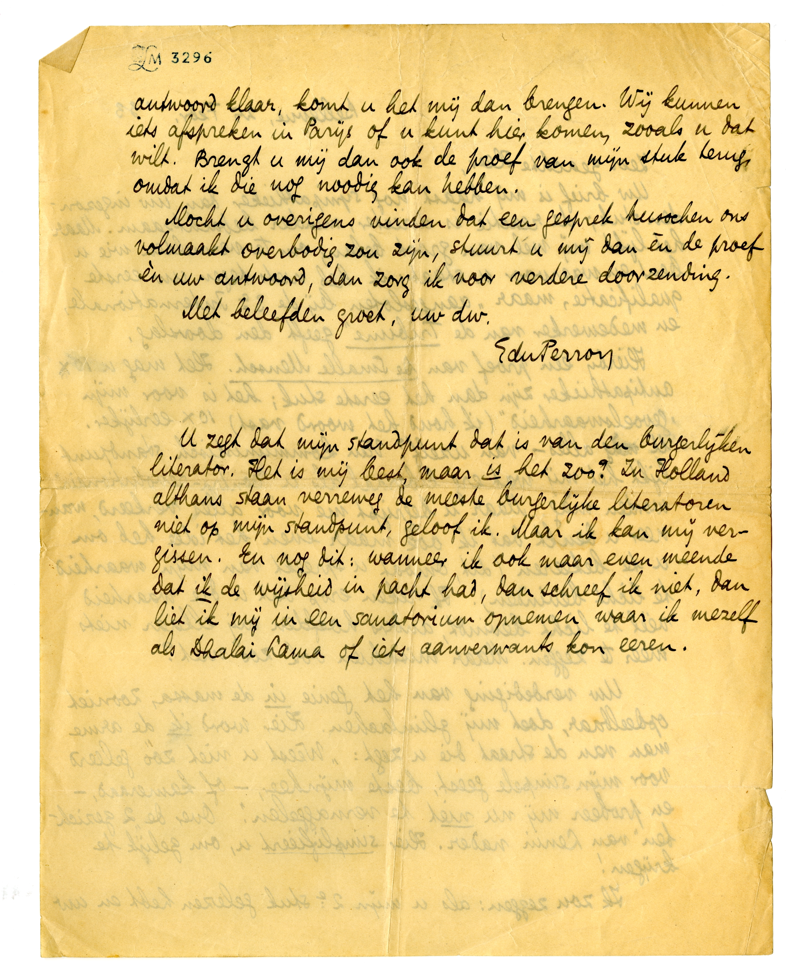 U zegt dat mijn standpunt dat is van den burgerlijken literator. Het is mij best, maar is het zoo? In Holland althans staan verreweg de meeste burgerlijke literatoren niet op mijn standpunt, geloof ik. Maar ik kan mij vergissen. En nog dit: wanneer ik ook maar even meende dat ik de wijsheid in pacht had, dan schreef ik niet, dan liet ik mij in een sanatorium opnemen waar ik mezelf als Dhalai Lama of iets aanverwants kon eeren.