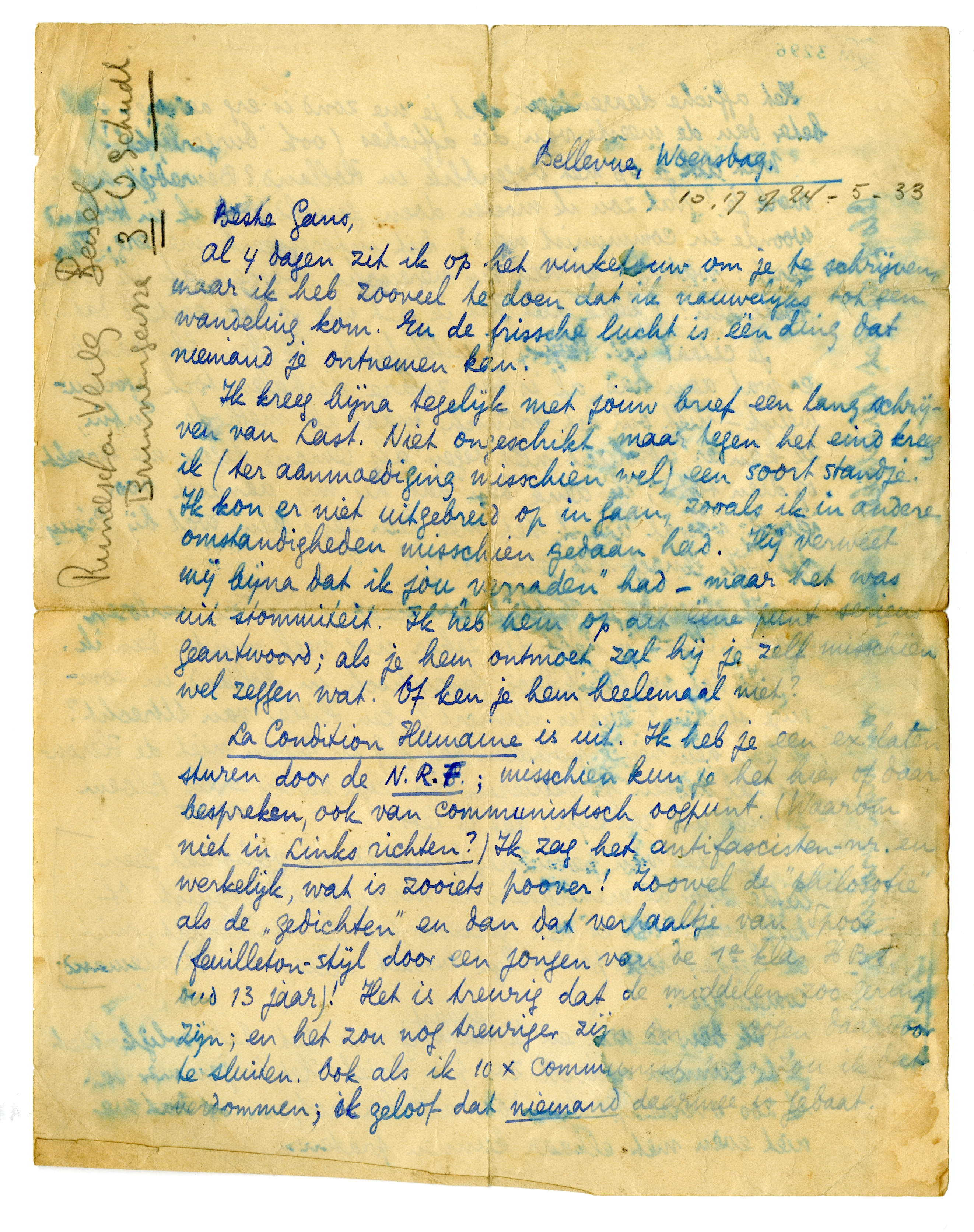 La Condition Humaine is uit. Ik heb je een ex. laten sturen door de N.R.F; misschien kun je het hier of daar bespreken, ook van communistisch oogpunt. (Waarom niet in Links richten?) Ik zag het antifascisten-nr. en werkelijk, wat is zooiets poover! Zoowel de ‘philosophie’ als de ‘gedichten’ en dan dat verhaaltje van Spoor33 (feuilleton-stijl door een jongen van de 1e klas H. BS. oud 13 jaar)! Het is treurig dat de middelen zoo gering zijn; en het zou nog treuriger zijn om de oogen daarvoor te sluiten. Ook als ik 10 x communist was, zou ik dat verdommen; ik geloof dat niemand daarmee is gebaat.