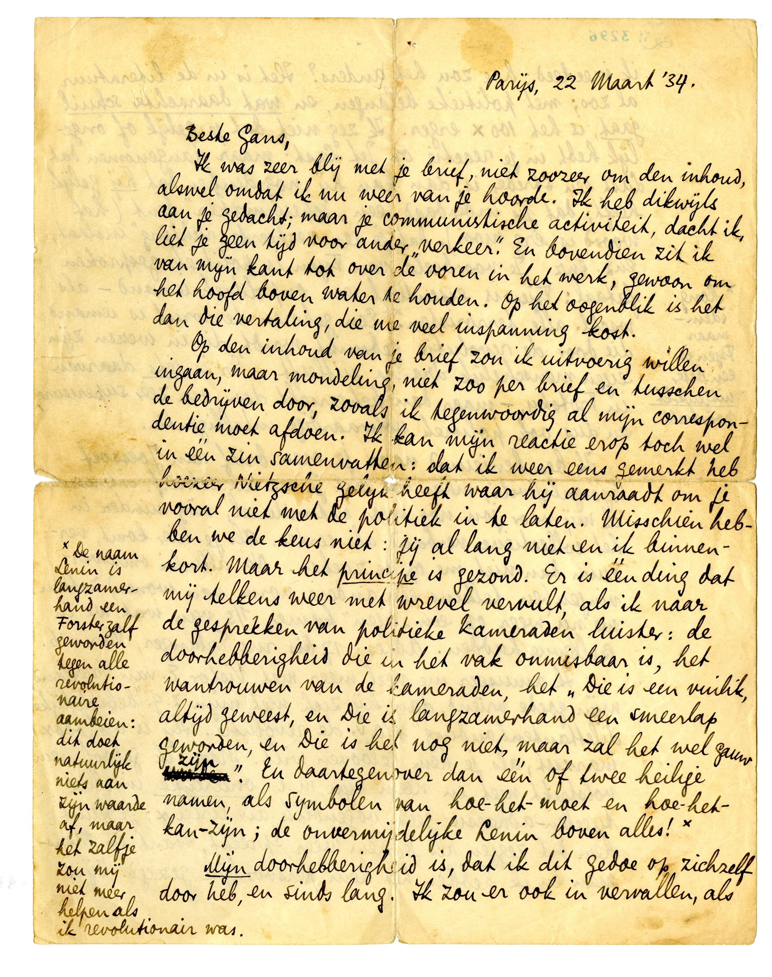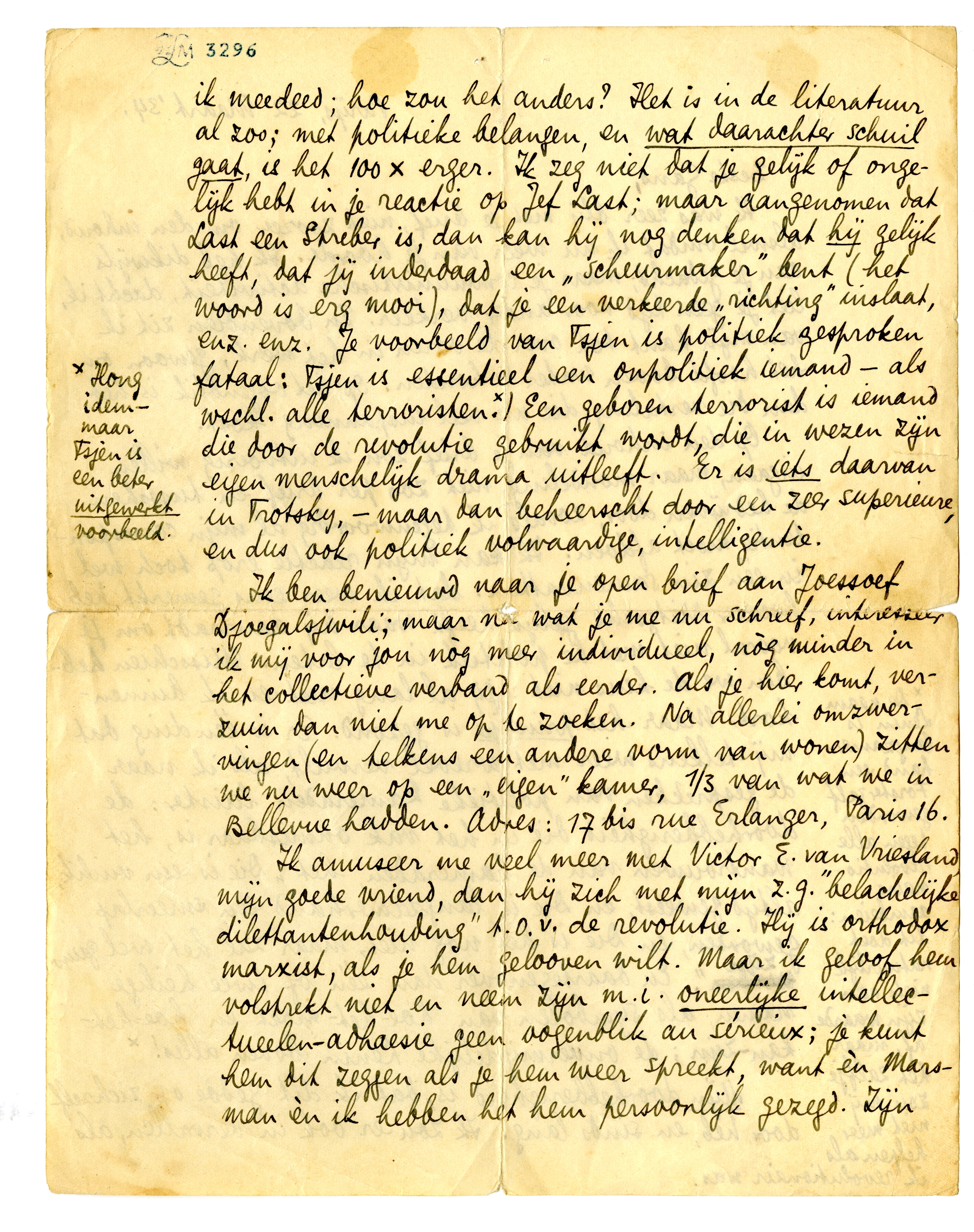 Ik ben benieuwd naar je open brief aan Joessoef Djoegalsjwili;41 maar na wat je me nu schreef, interesseer ik mij voor jou nòg meer individueel, nòg minder in het collectieve verband als eerder. Als je hier komt, verzuim dan niet me op te zoeken. Na allerlei omzwervingen (en telkens een andere vorm van wonen) zitten we nu weer op een ‘eigen’ kamer, 1/3 van wat we in Bellevue hadden. Adres: 17bis rue Erlanger, Paris 16.