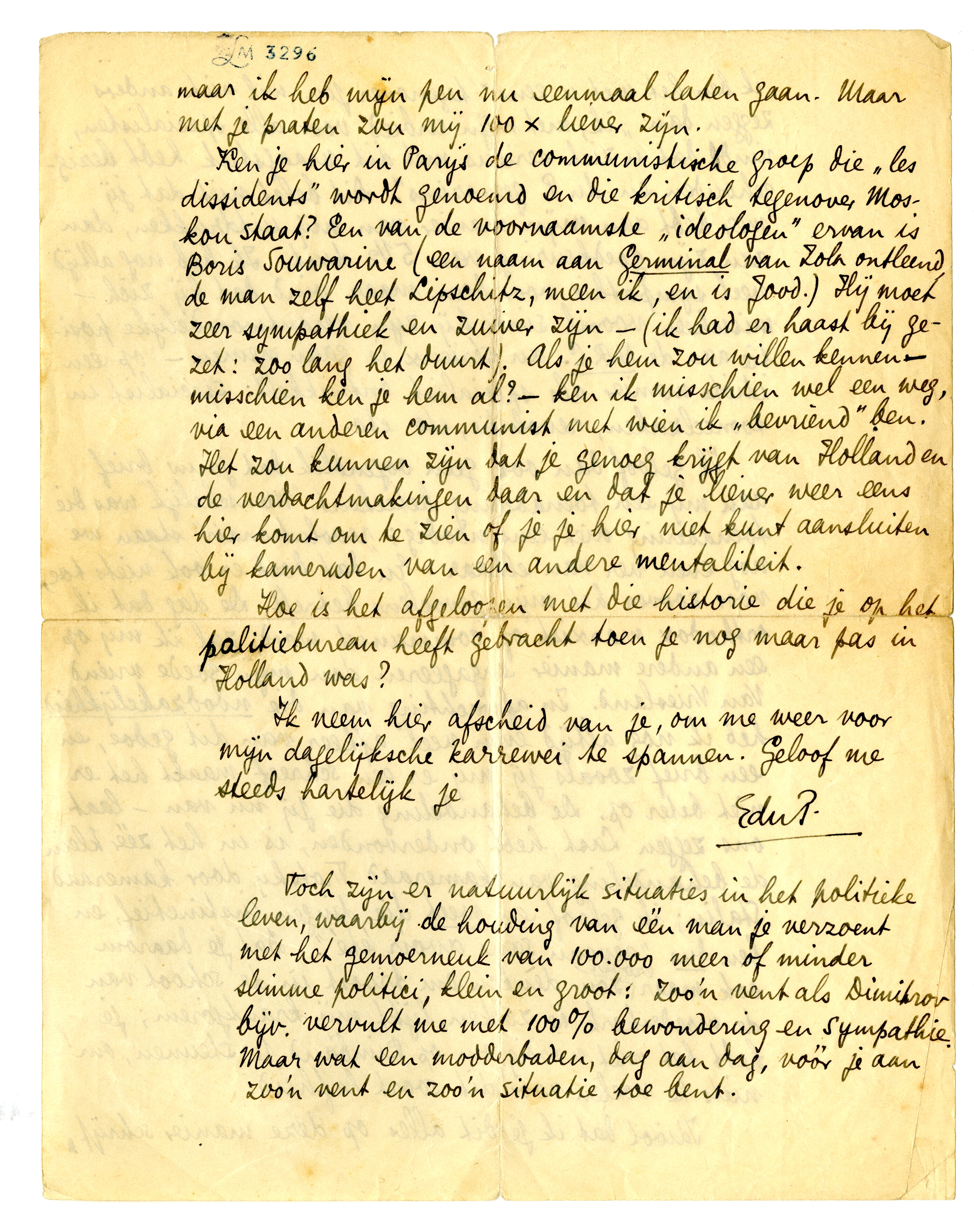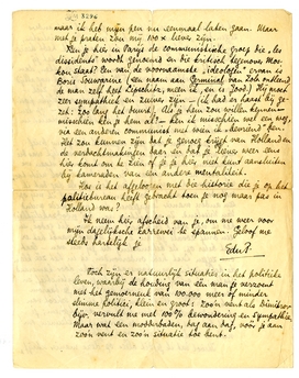 Ken je hier in Parijs de communistische groep die ‘les dissidents’ wordt genoemd en die kritisch tegenover Moskou staat? Een van de voornaamste ‘ideologen’ ervan is Boris Souwarine42 (een naam aan Germinal van Zola ontleend, de man zelf heet Lipschitz, meen ik, en is Jood) Hij moet zeer sympathiek en zuiver zijn -(ik had er haast bij gezet: zoo lang het duurt). Als je hem zou willen kennen - misschien ken je hem al? - ken ik misschien wel een weg, via een anderen communist met wien ik ‘bevriend’ ben. Het zou kunnen zijn dat je genoeg krijgt van Holland en de verdachtmakingen daar en dat je liever weer eens hier komt om te zien of je je liier niet kunt aansluiten bij kameraden van een andere mentaliteit.