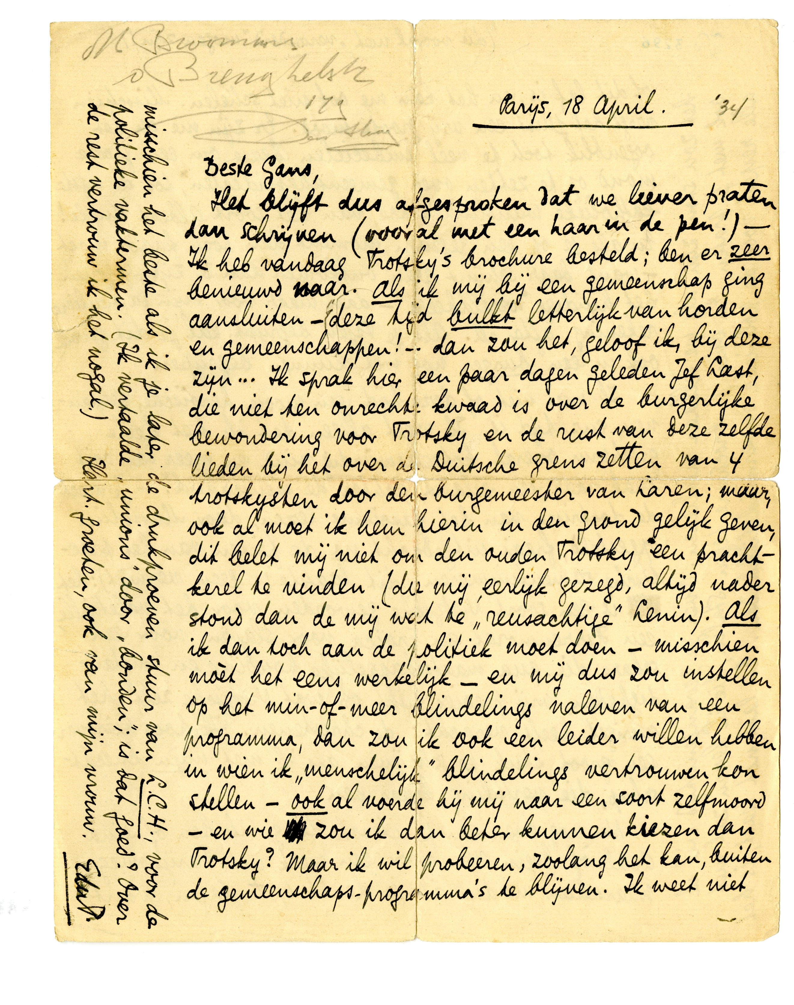 Nu nog even één practisch ding: ik ben òf eind April òf begin Mei voor een week uit Parijs weg. Waarschuw me dus als je denkt op te dagen, want het zou stom zijn als we elkaar misliepen. Over je gevangenistijd wil ik ook met je praten. En over je brochure tegen Stalin, die ik lezen zal met alle respect voor de politieke onvermijdelijkheden. En last not least, is het misschien het beste als ik je later de drukproeven stuur van L.C.H., voor de politieke vaktermen. (Ik vertaalde ‘unions’ door ‘bonden’; is dat goed? Over de rest vertrouw ik het nogal.)