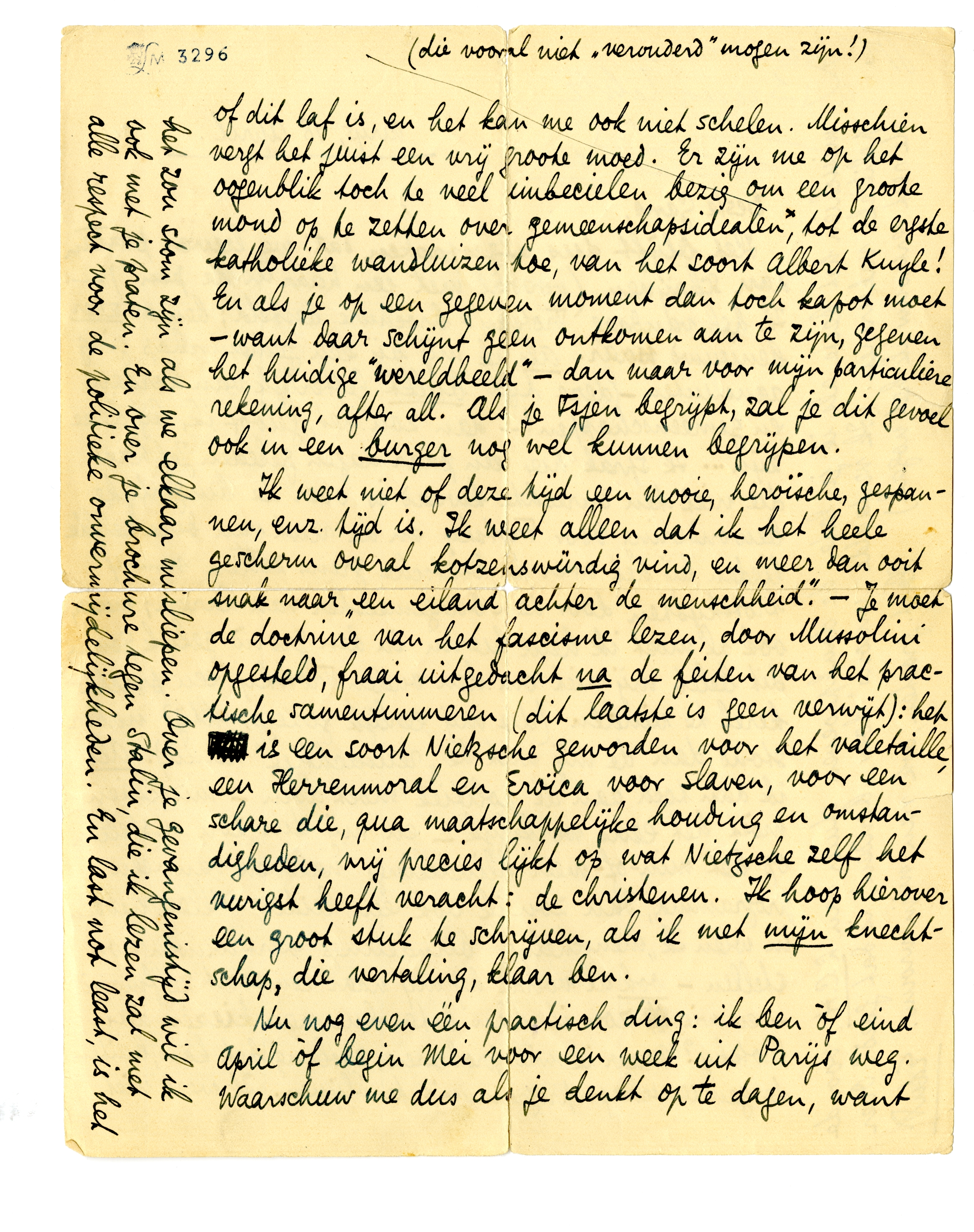 Ik weet niet of deze tijd een mooie, heroïsche, gespannen, enz. tijd is. Ik weet alleen dat ik het heele gescherm overal kotzenswürdig vind, en meer dan ooit snak naar ‘een eiland achter de menschheid’. - Je moet de doctrine van het fascisme lezen,48 door Mussolini opgesteld, fraai uitgedacht na de feiten van het practische samentimmeren (dit laatste is geen verwijt): het is een soort Nietzsche geworden voor het valetaille, een Herrenmoral en Eroïca voor slaven, voor een schare die, qua maatschappelijke houding en omstandigheden, vrij precies lijkt op wat Nietzsche zelf het vurigst heeft veracht: de christenen. Ik hoop hierover een groot stuk te schrijven, als ik met mijn knechtschap, die vertaling, klaar ben.