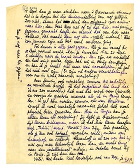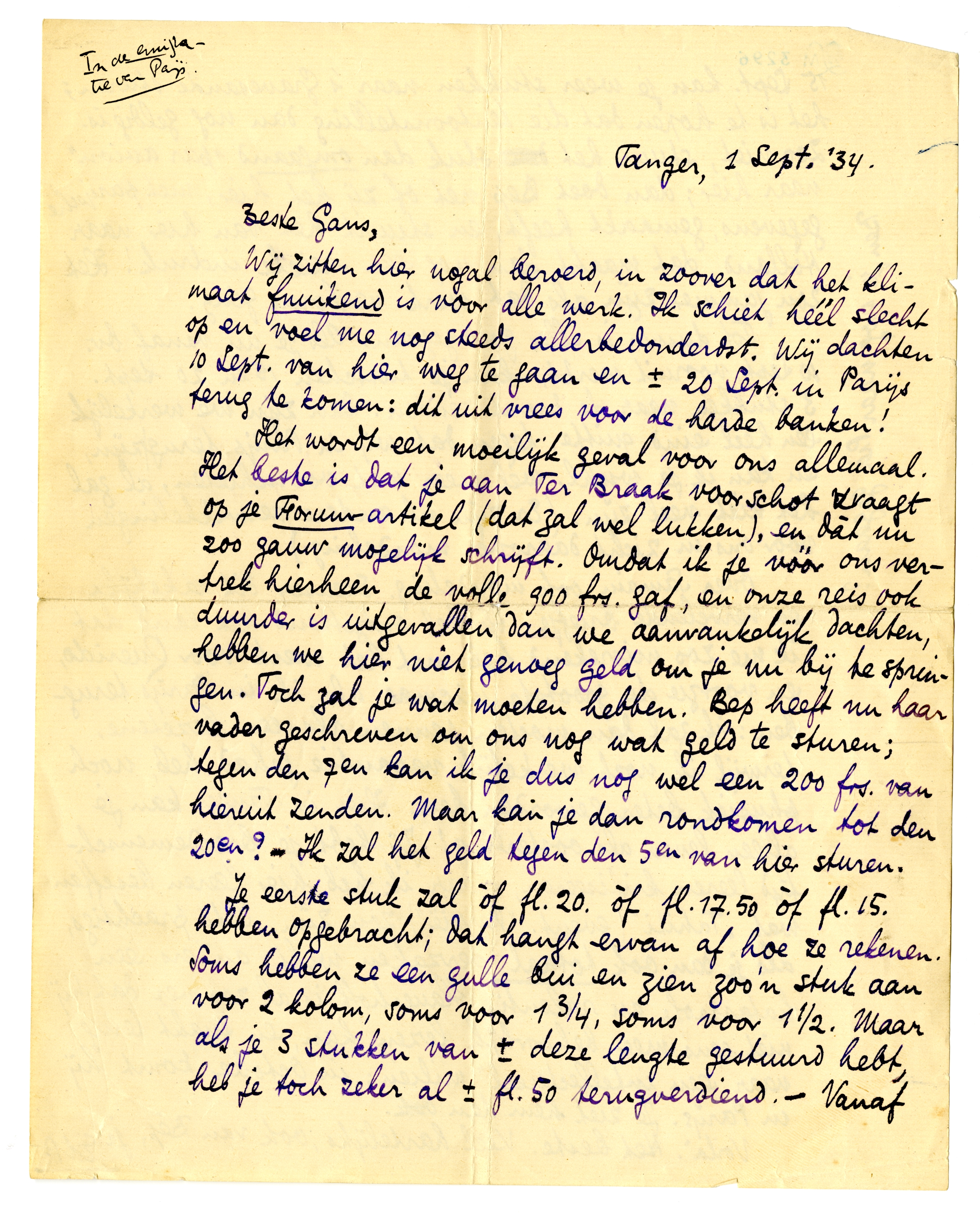 Het wordt een moeilijk geval voor ons allemaal. Het beste is dat je aan Ter Braak voorschot vraagt op je Forum-artikel (dat zal wel lukken), en dàt nu zoo gauw mogelijk schrijft. Omdat ik je vóór ons vertrek hierheen de volle 900 frs. gaf, en onze reis ook duurder is uitgevallen dan we aanvankelijk dachten, hebben we hier niet genoeg geld om je nu bij te springen. Toch zal je wat moeten hebben. Bep heeft nu haar vader geschreven om ons nog wat geld te sturen; tegen den 7en kan ik je dus nog wel een 200 frs. van hieruit zenden. Maar kan je dan rondkomen tot den 20en? - Ik zal het geld tegen den 5en van hier sturen.