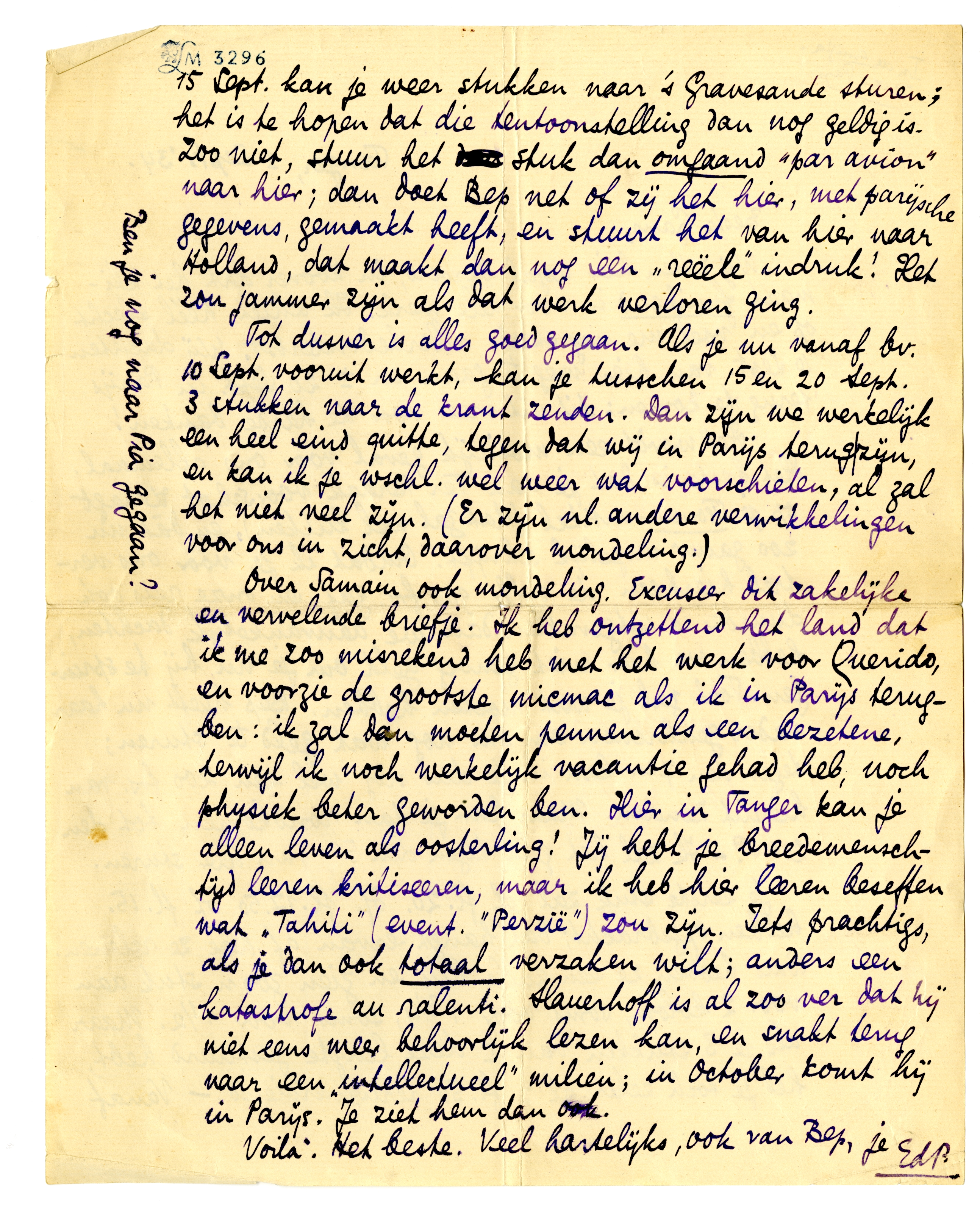 Over Samain69 ook mondeling. Excuseer dit zakelijke en vervelende briefje. Ik heb ontzettend het land dat ik me zoo misrekend heb met het werk voor Querido, en voorzie de grootste micmac als ik in Parijs terugben: ik zal dan moeten pennen als een bezetene, terwijl ik noch werkelijk vacantie gehad heb, noch physiek beter geworden ben. Hier in Tanger kan je alleen leven als oosterling! Jij hebt je breedemenschtijd leeren kritiseeren, maar ik heb hier leeren beseffen wat ‘Tahiti’ (event. ‘Perzië’) zou zijn. Iets prachtigs, als je dan ook totaal verzaken wilt; anders een katastrofe au ralenti. Slauerhoff is al zoo ver dat hij met eens meer behoorlijk lezen kan, en snakt terug naar een ‘intellectueel’ milieu; in October komt hij in Parijs. Je ziet hem dan ook.