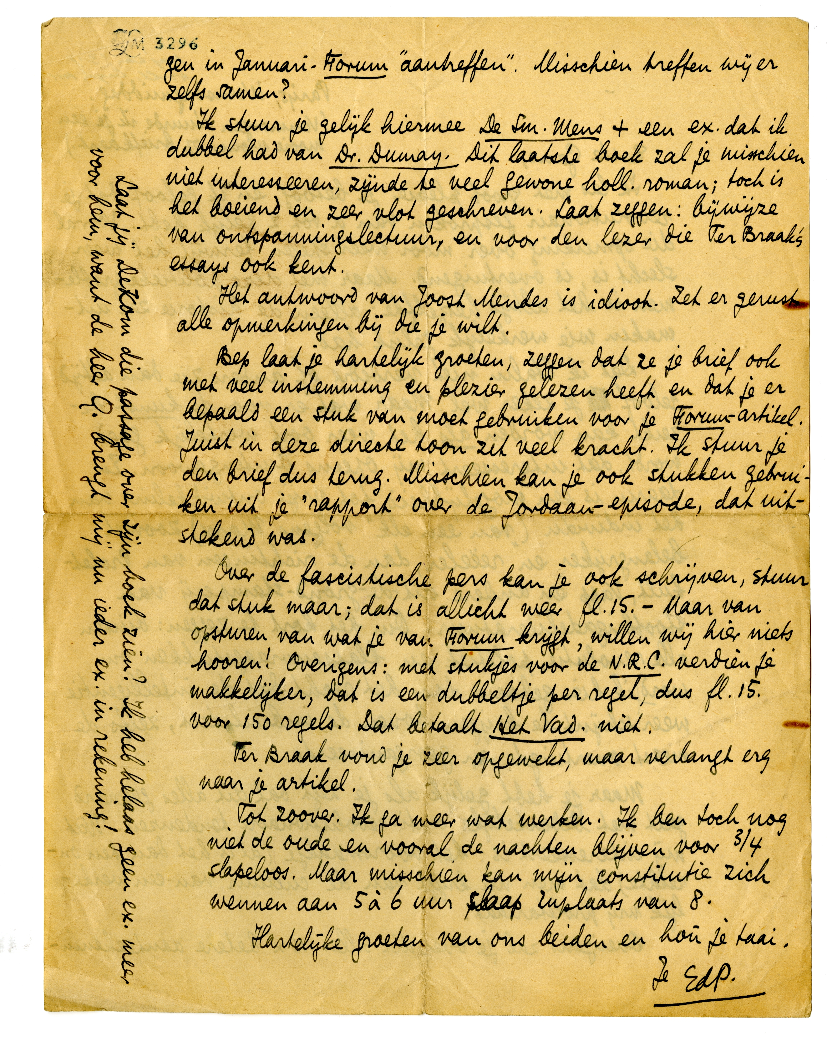Over de fascistische pers kan je ook schrijven, stuur dat stak maar; dat is allicht weer fl.15. - Maar van opsturen van wat je van Forum krijgt, willen wij hier niets hooren! Overigens: met stukjes voor de N.R.C. verdien je makkelijker, dat is een dubbeltje per regel, dus fl 15. voor 150 regels. Dat betaalt Het Vad. niet.