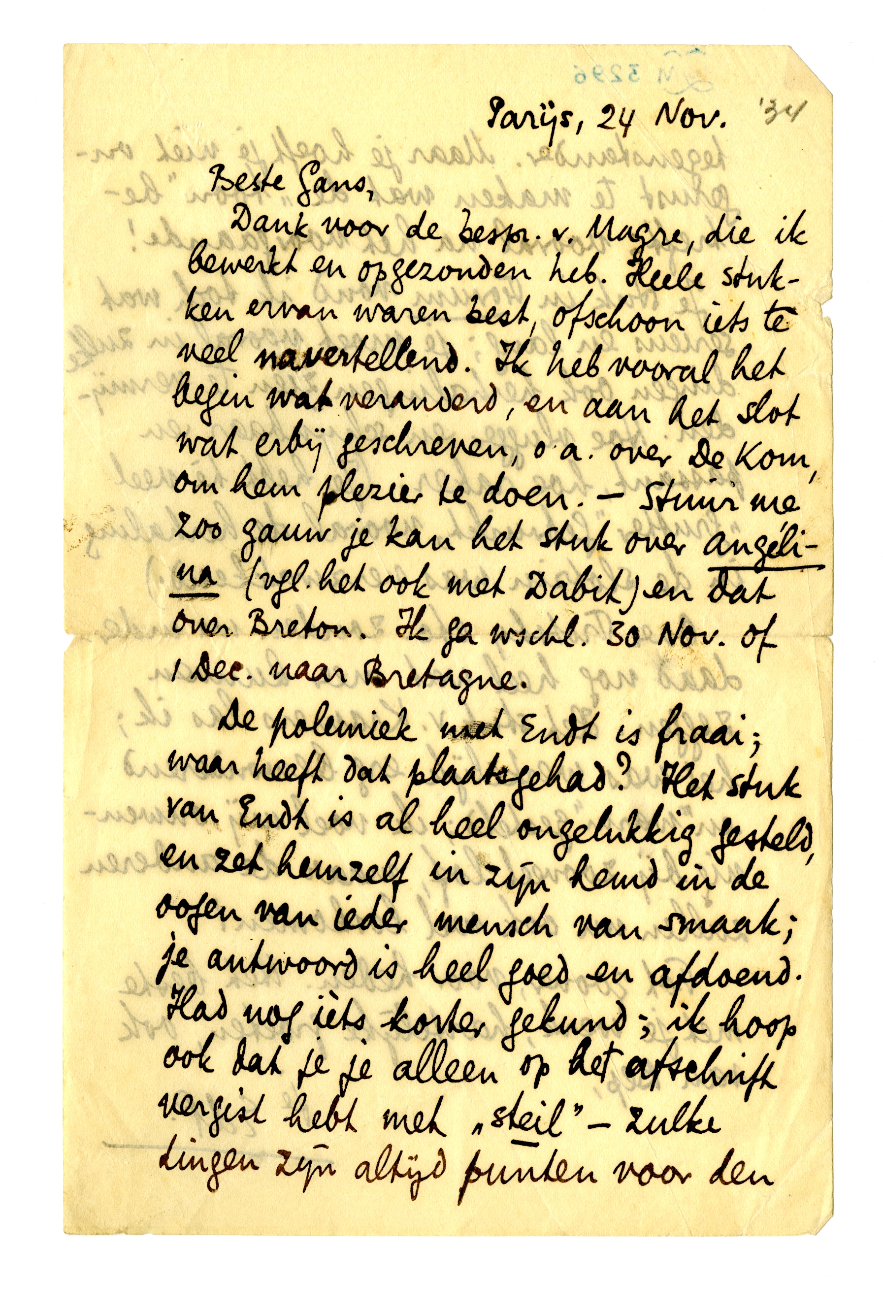 Dank voor de bespr. v. Magre,108 die ik bewerkt en opgezonden heb. Heele stukken ervan waren best, ofschoon iets te veel navertellend. Ik heb vooral het begin wat veranderd, en aan het slot wat erbij geschreven, o.a. over De Kom, om hem plezier te doen. - Stuur me zoo gauw je kan het stuk over Angélina (vgl. het ook met Dabit) en dat over Breton.109 Ik ga wschl. 30 Nov. of 1 Dec. naar Bretagne.