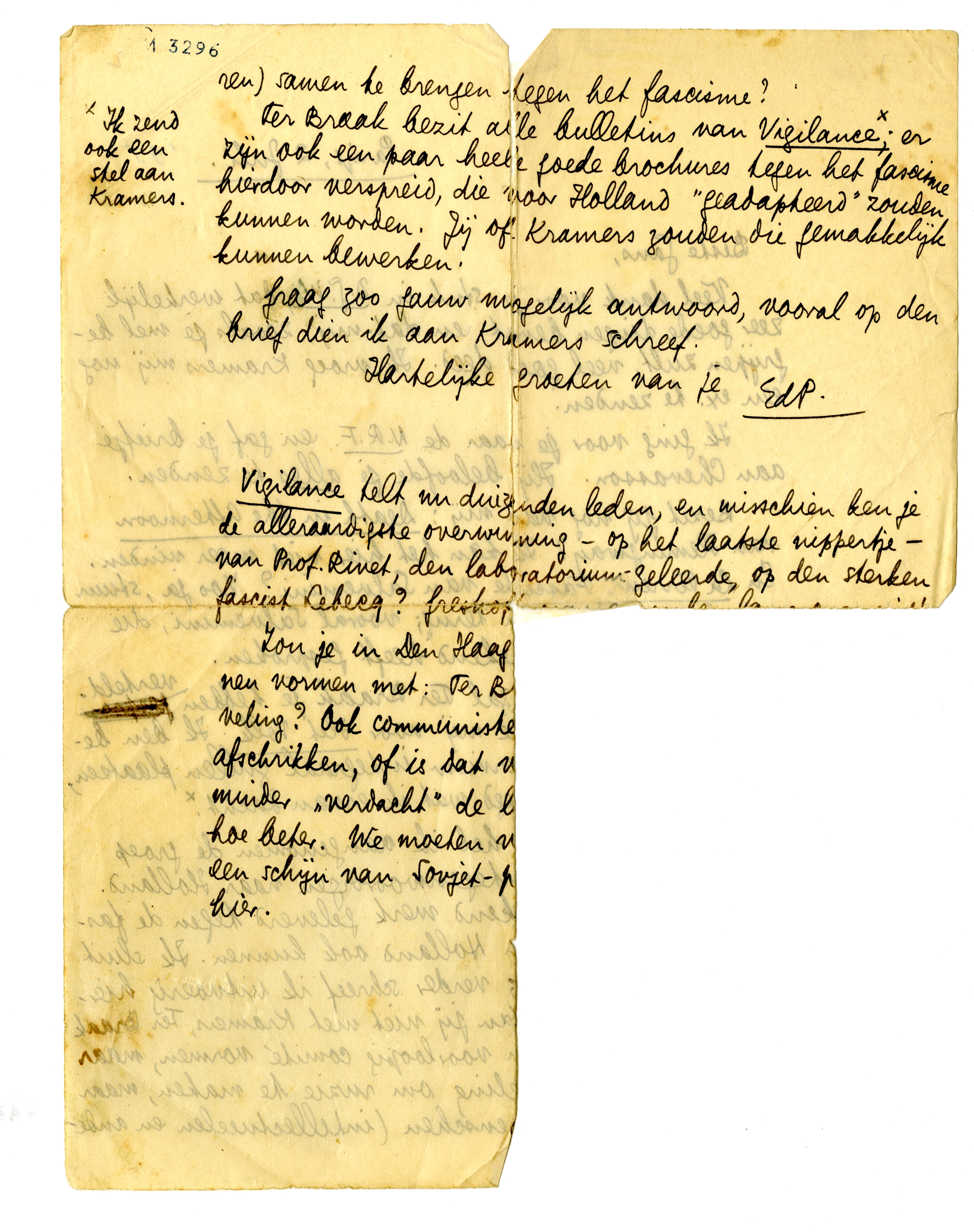 Ter Braak bezit alle bulletins van Vigilance*;128 er zijn ook een paar heele goede brochures tegen het fascisme hierdoor verspreid, die voor Holland ‘geadapteerd’ zouden kunnen worden. Jij of Kramers zouden die gemakkelijk kunnen bewerken.