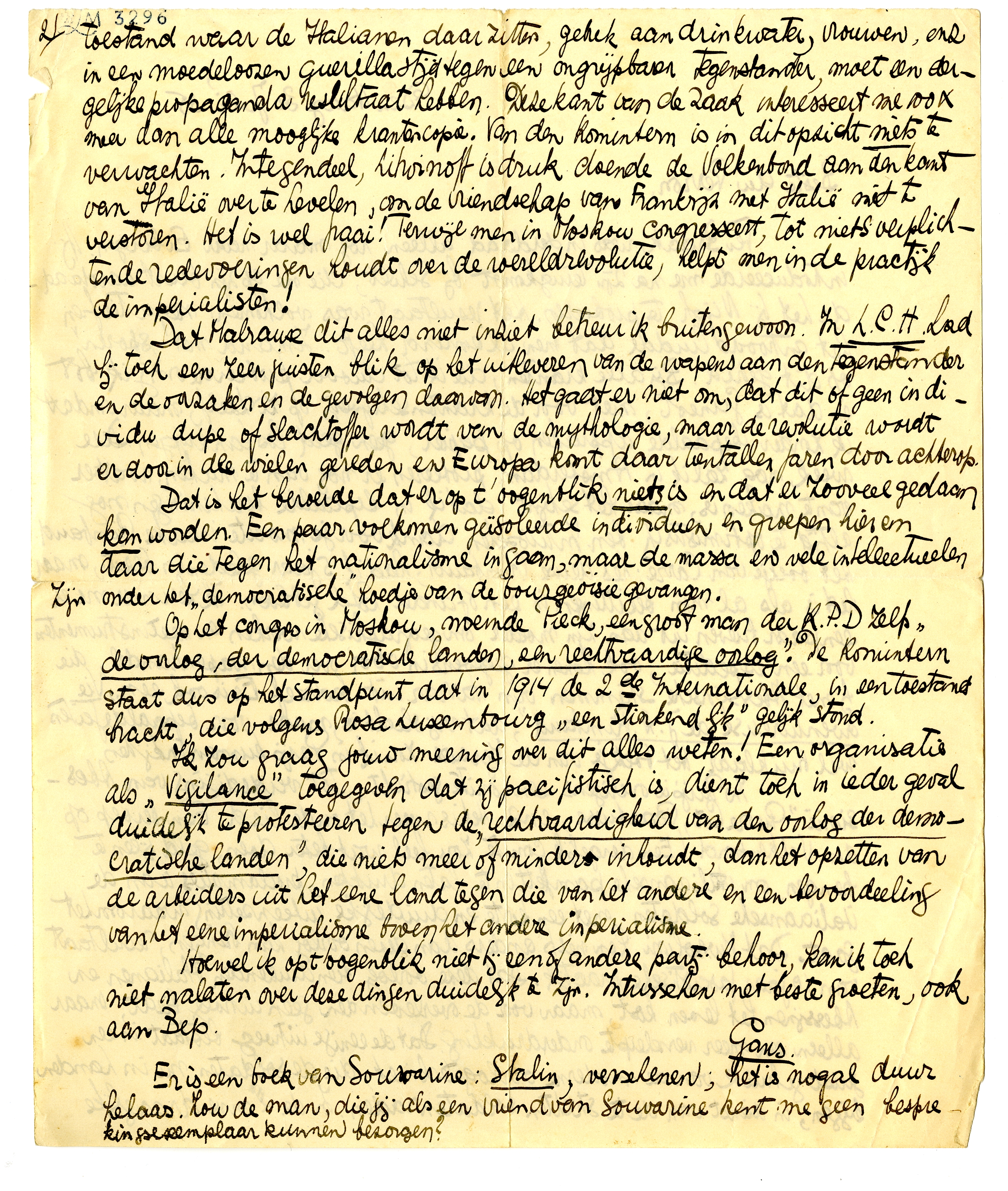 Ik zou graag jouw meening over dit alles weten! Een organisatie als ‘Vigilance’, toegegeven dat zij pacifistisch is, dient toch in ieder geval duidelijk te protesteeren tegen de ‘rechtvaardigheid van den oorlog der democratische landen’, die niets meer of minder inhoudt, dan het opzetten van de arbeiders uit het eene land tegen die van het andere en een beoordeling van het eene imperialisme boven het andere imperialisme.