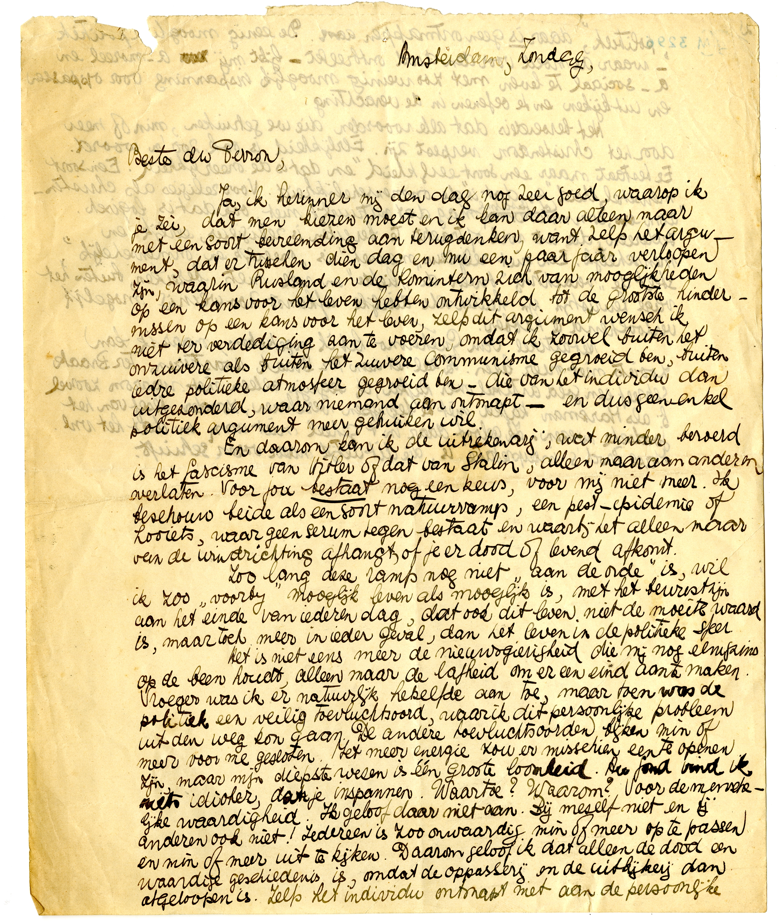 Ja, ik herinner mij den dag nog zeer goed, waarop ik je zei, dat men kiezen moest en ik kan daar alleen maar met een soort bevreemding aan terugdenken, want zelfs het argument, dat er tusschen dien dag en nu een paar jaar verlopen zijn, waarin Rusland en de Komintern zich van mooglijkheden op een kans voor het leven hebben ontwikkeld tot de grootste hindernissen op een kans voor het leven, zelfs dit argument wensch ik niet ter verdediging aan te voeren, omdat ik zoowel buiten het onzuivere als buiten het zuivere
